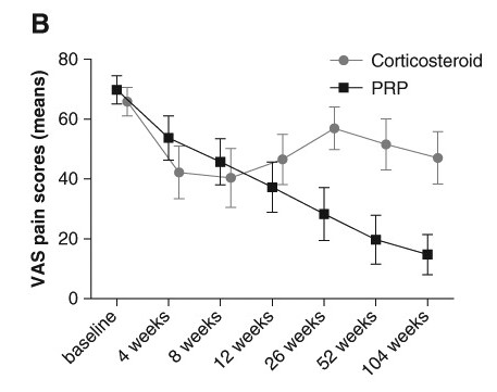 급성기를 지난 시기인 12주 이후부터는 PRP가 스테로이드에 비해 통증을 더 줄여주는 것을 확인할 수 있습니다.