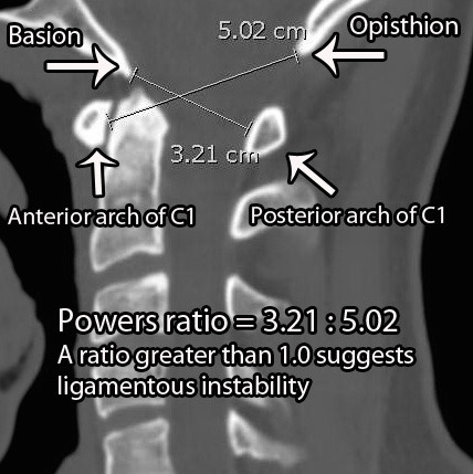 X-ary 상에서 A:B=Basion-Posterior arch(C1) : Anterior arch-Opisthion 길이 비율을 측정하여 dislocation 여부를 알 수 있습니다.